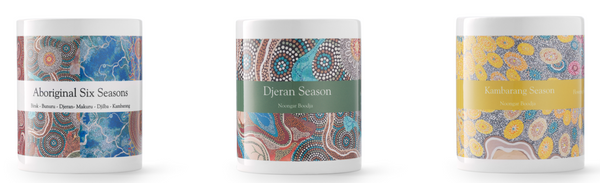 100% Soy candles, infused with six unique fragrance oils that represent the changing Seasons of Birak, Bunuru, Djeran, Makuru, Djilba, and Kambarang.